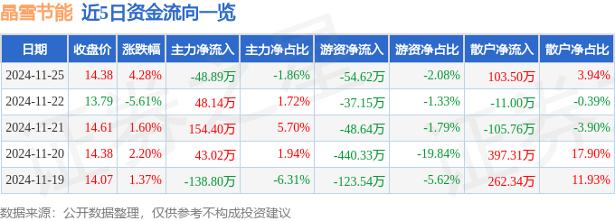 本站消息,截至2024年11月25日收盘,晶雪节能(301010)报收于14.38元,上涨4.28%,换手率1.72%,成交量1.86万手,成交额2629.67万元。